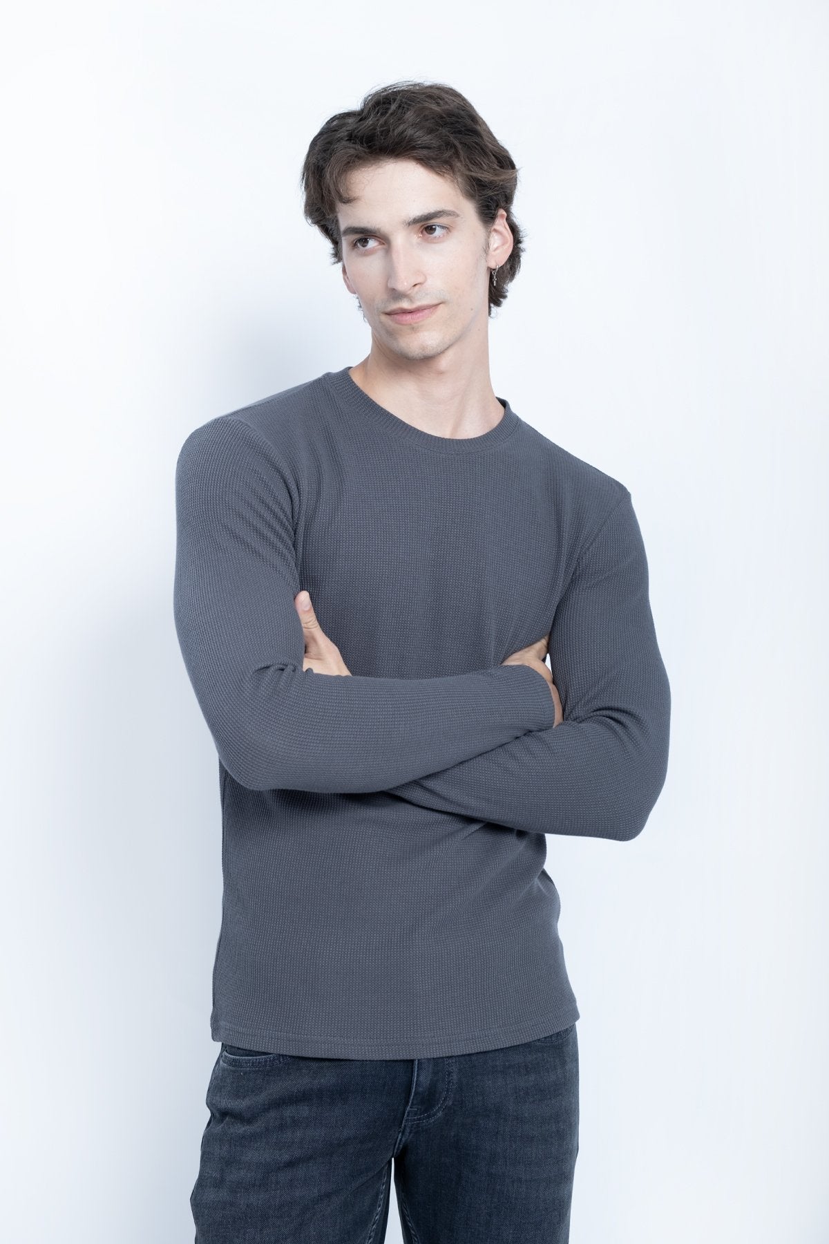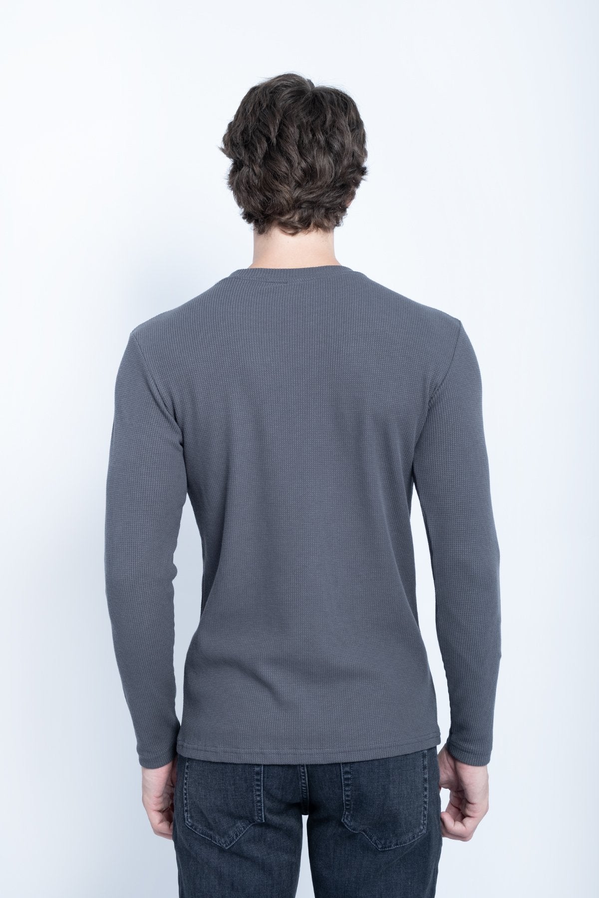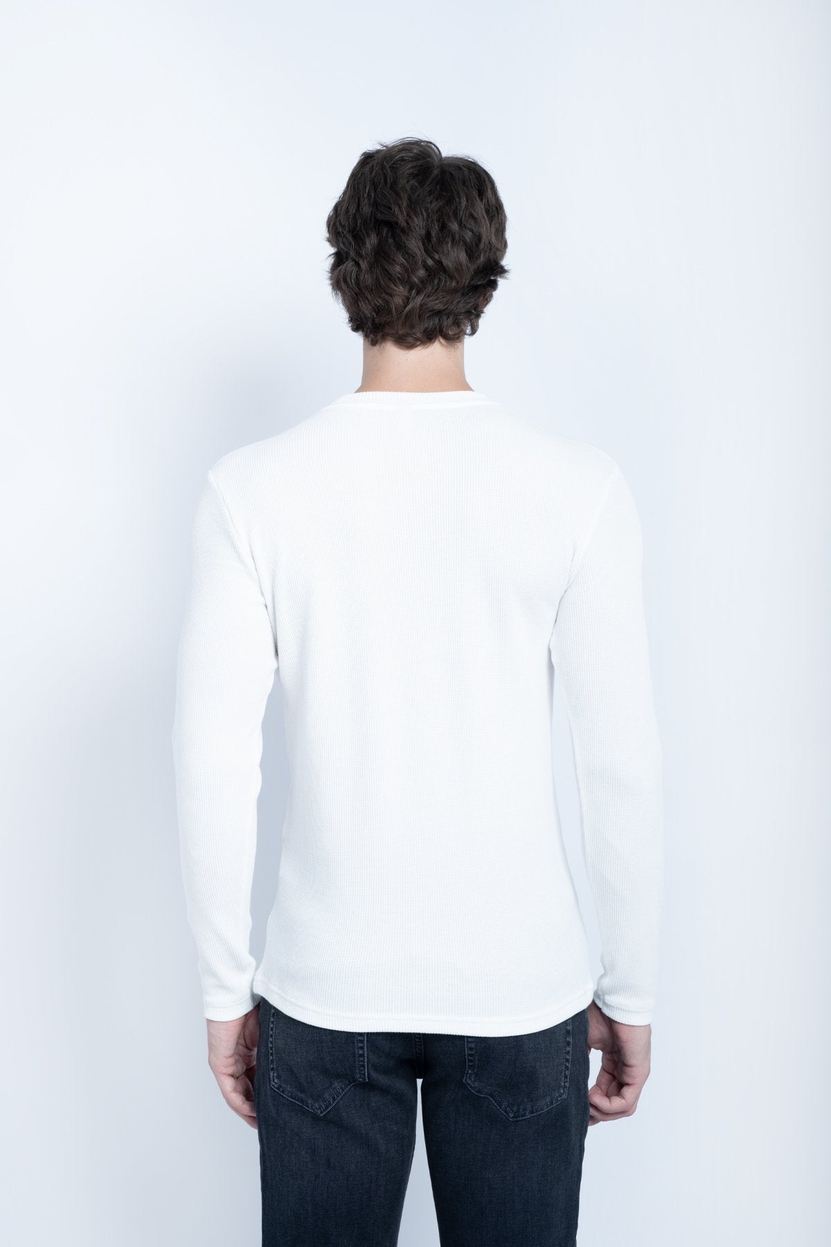 This sweatshirt is made from waffle-textured fabric, giving it a soft, structured feel with a subtle grid pattern. The basic 0-neck design offers a clean and minimal look, making it perfect for everyday wear.